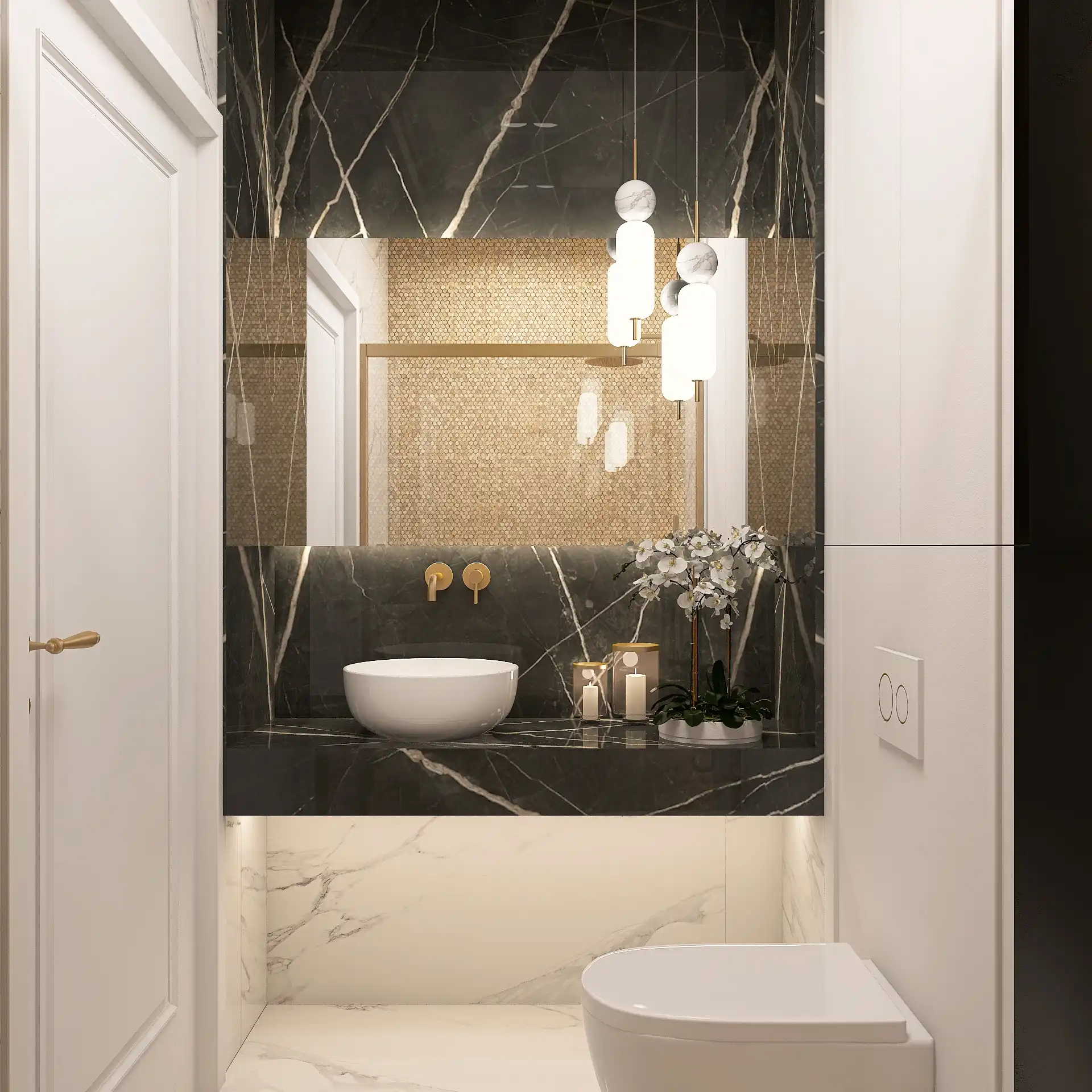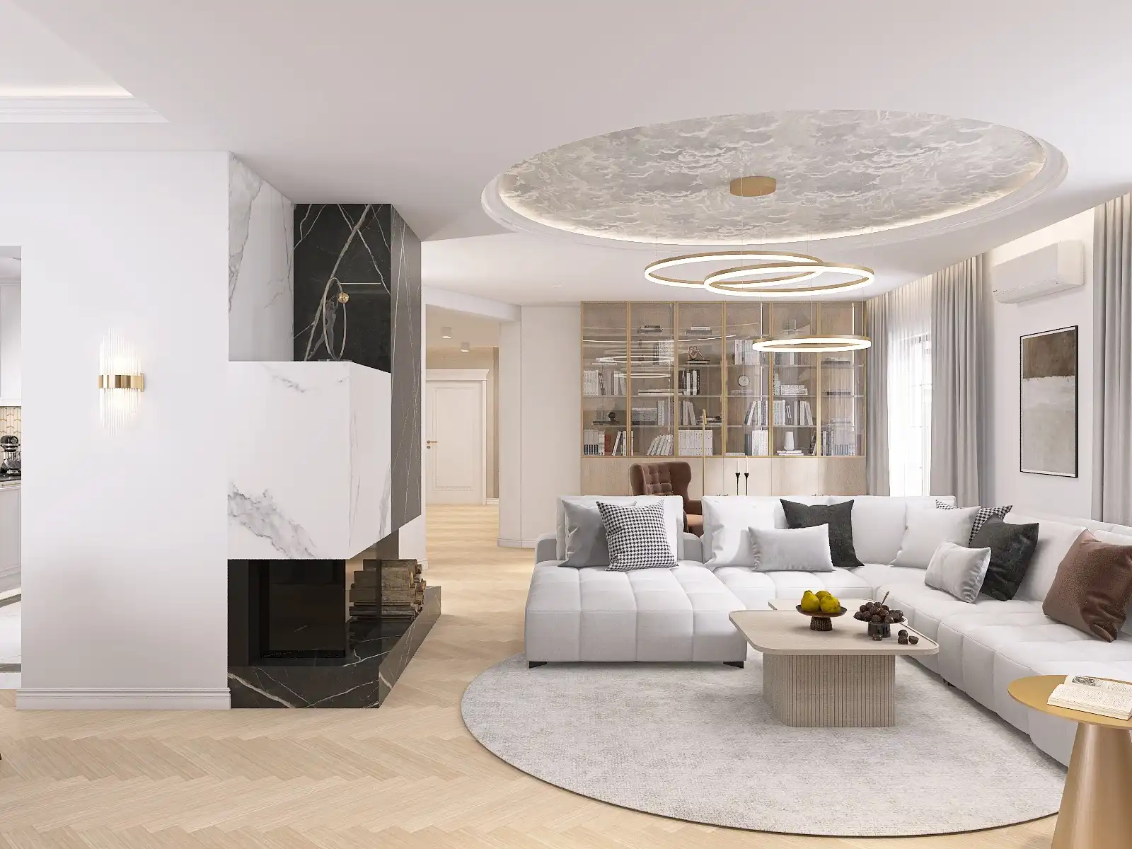 Projekt przebudowy domu z rynku wtórnego w Będzinie, utrzymany w stylu ponadczasowej elegancji. Salon z podwieszanym sufitem w kształcie koła i tapetą w chmury zyskał wyjątkowy charakter. Wnętrza pełne są klasycznych akcentów – matowe, szczotkowane złoto, wielkoformatowe płytki w odcieniach bieli i czerni oraz przemyślana symetria. Sypialnia została połączona z przestronną garderobą, a w łazienkach dominuje klasyka z nutą luksusu. Całość uzupełniają liczne zabudowy i uroczy pokój dla małego miłośnika sarenek.