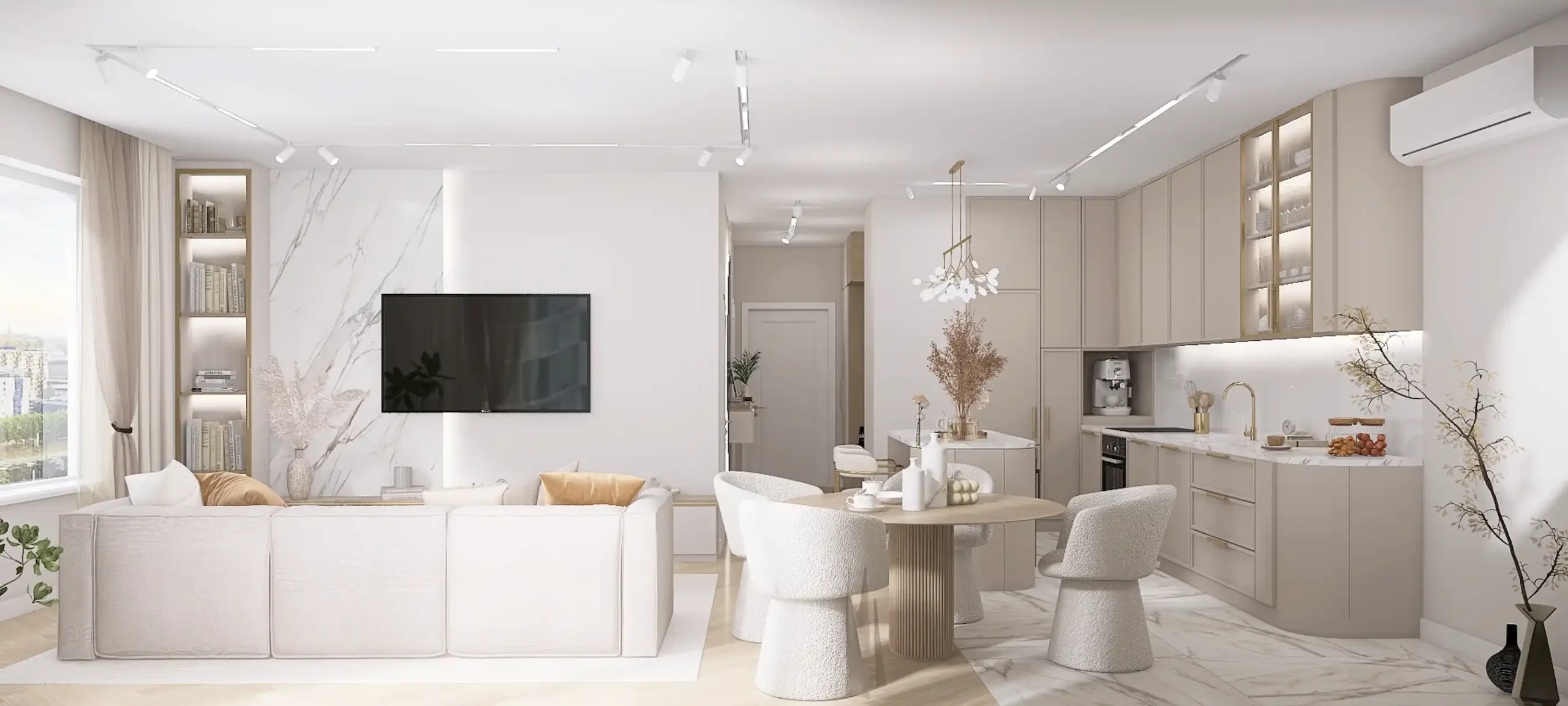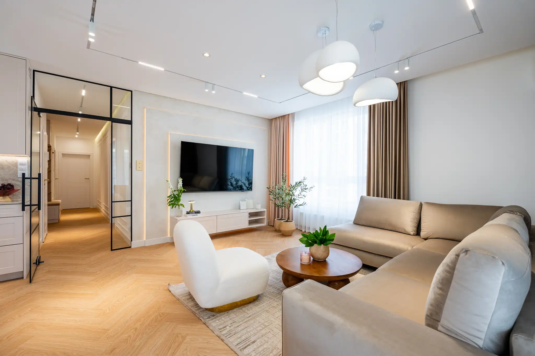 Stworzyliśmy butikowy apartament o jasnej kolorystyce, z kaszmirowymi frontami mebli i dużą funkcjonalnością. Sypialnię połączyliśmy z przeszkloną łazienką do relaksu i garderobą. W drugiej łazience zaprojektowaliśmy sufitowy kran i komfortowy prysznic. Kuchnię powiększyliśmy i otworzyliśmy na jadalnię oraz salon. W stylowym gabinecie powstało wygodne miejsce do pracy. Całość – spójna, elegancka i ponadczasowa.