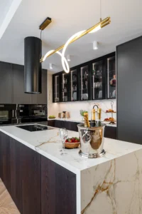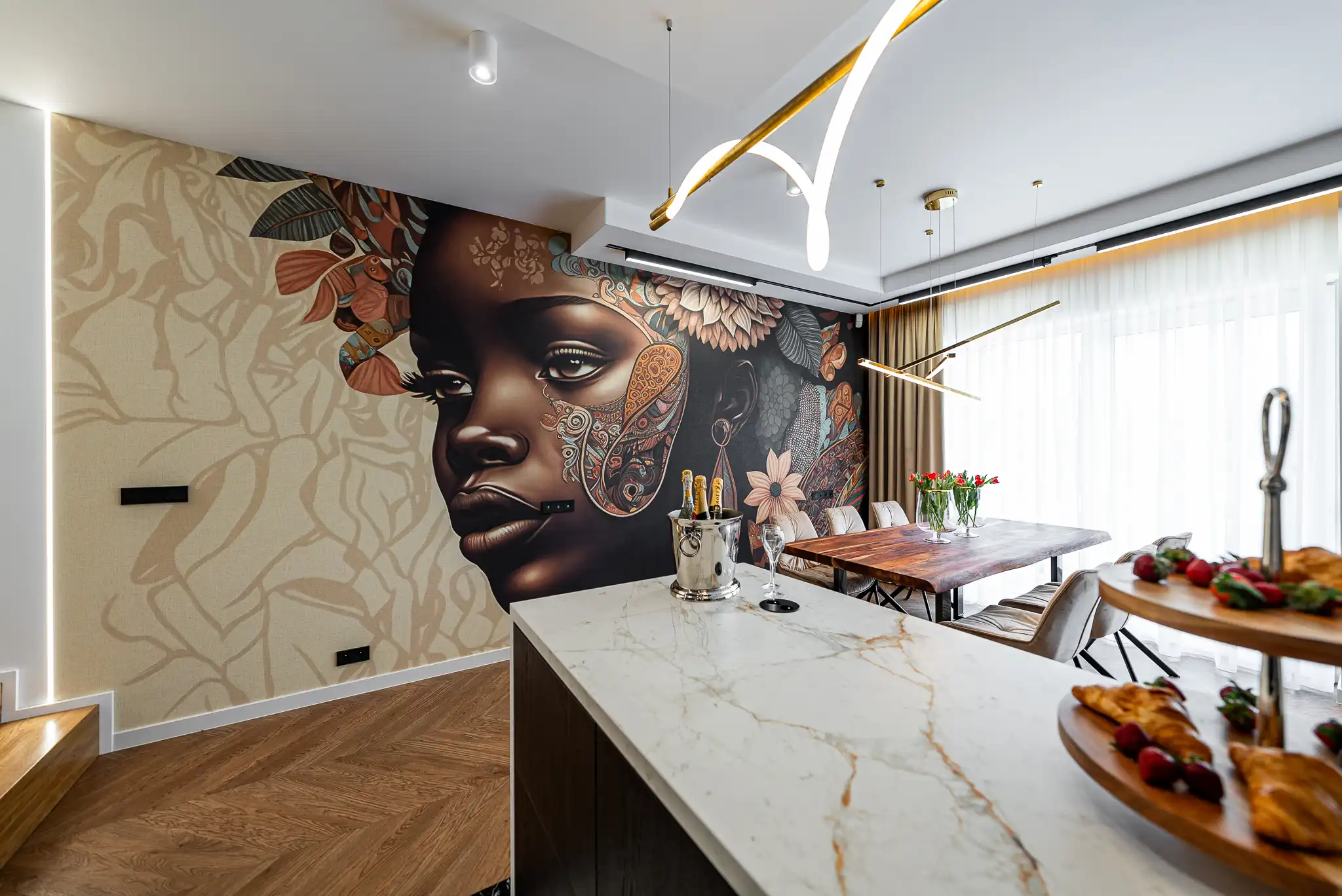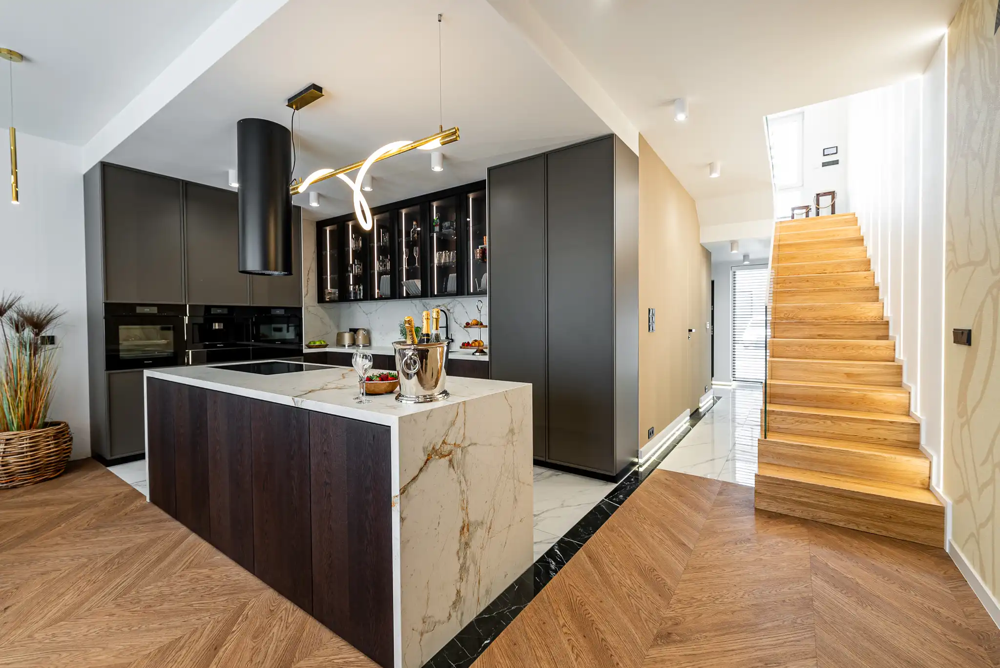 Stworzyliśmy elegancką i funkcjonalną przestrzeń, w której ciepłe drewno, designerskie podłogi i nastrojowe oświetlenie budują niepowtarzalny klimat. Salon zdobi tapeta w stylu afrykańskim, a kuchnia w ciemnych barwach zachwyca luksusowym wykończeniem. W całym domu zaprojektowaliśmy przemyślaną zabudowę stolarską – pod schodami, w garderobie, łazienkach, sypialni i gabinecie. Projekt łączy estetykę z wygodą, podkreślając potencjał wnętrza zgodnie z oczekiwaniami inwestorów.