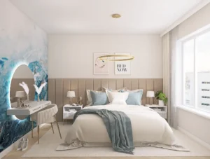 Salon z aneksem kuchennym w ciepłych odcieniach beżu tworzy przytulną, domową strefę relaksu – dokładnie tak, jak marzyli inwestorzy. Zabudowa w jasnym beżu zapewnia mnóstwo miejsca do przechowywania, a przy wejściu zaprojektowaliśmy pojemną szafę z praktycznym siedziskiem. W sypialni króluje harmonijne połączenie beżu i błękitu, które przywołuje na myśl ukochane przez właścicieli nadmorskie krajobrazy. Całość uzupełnia wygodne, tapicerowane zagłowie i oryginalna toaletka. Łazienka została wykończona ponadczasowym trawertynem – naturalnie, elegancko i z klasą.
